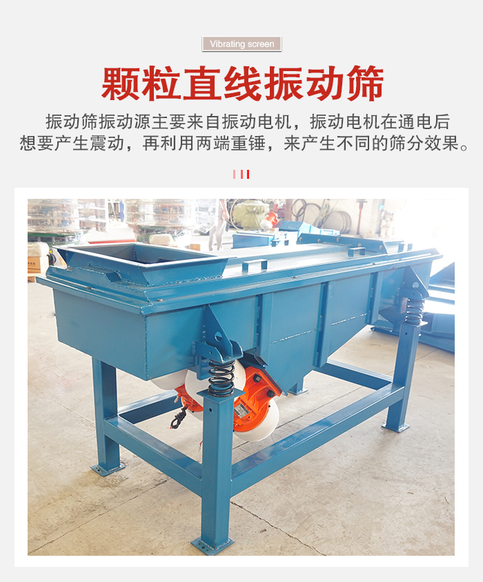 顆粒直線振動篩振動源主要來自振動電機,振動電機在通電后想要產生震動,再利用兩端重錘,來產生不同的篩分效果。